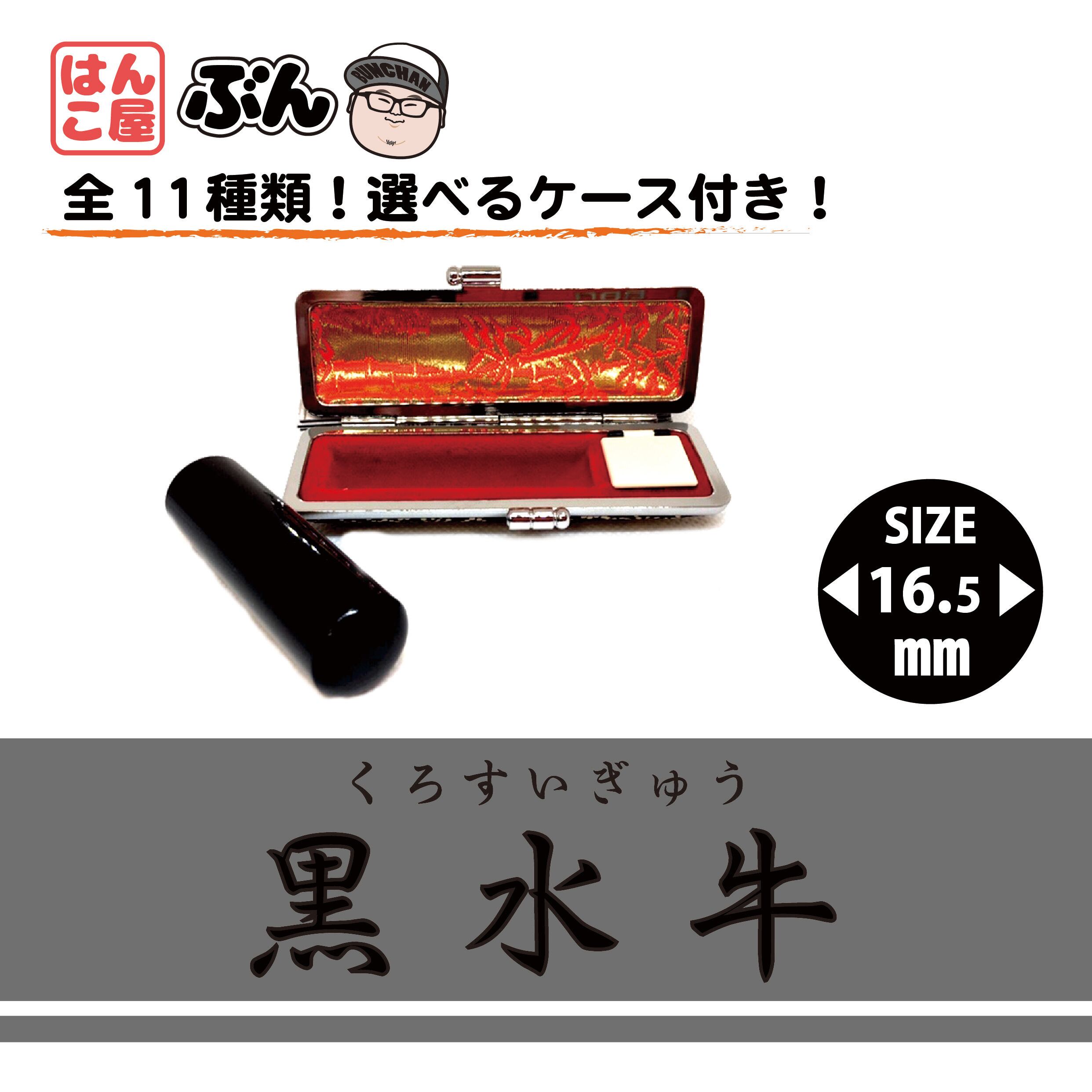 水牛の黒い角を使った印座。芯持と呼ばれる高品質な部分も使用しており、粘りがあり大変硬く、彫刻時に感じられる高密度な繊維から耐久性も抜群です。落ち着いた美しい黒い染めとそれに対照的な印面の朱が人気となっているようです。